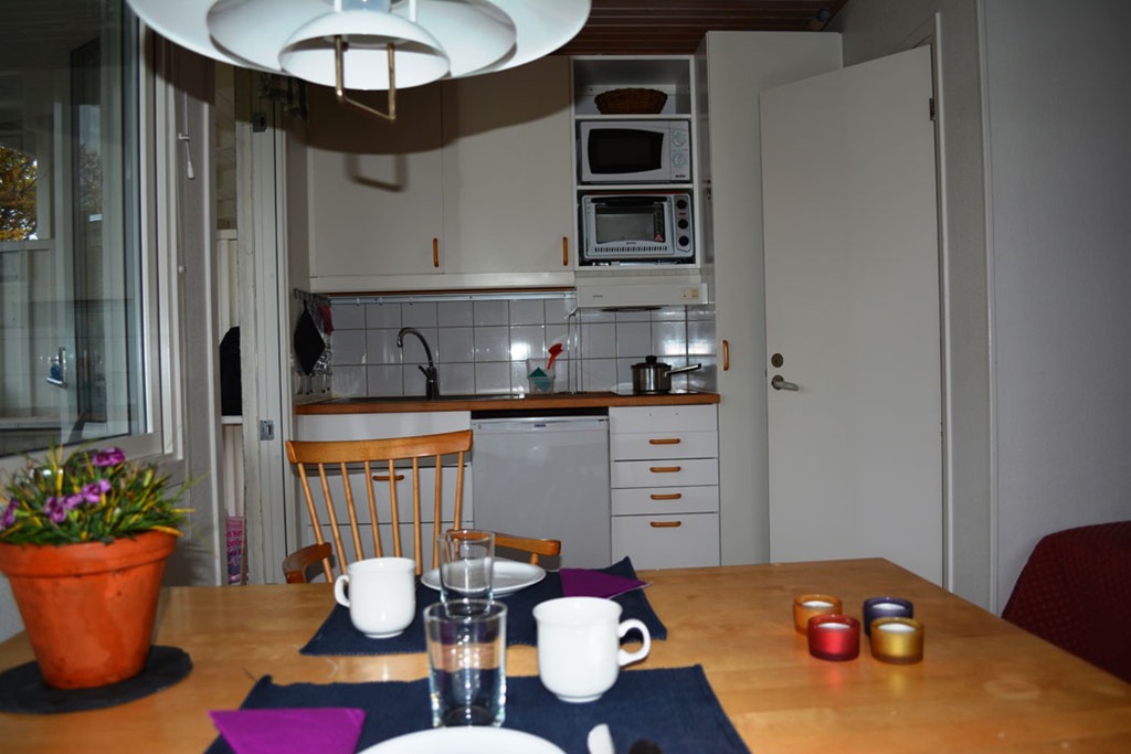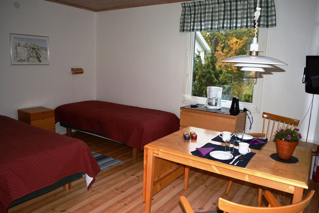 Studiolägenhet om ca 18,5 kvm med plats för två personer och möjlighet till extrasäng. Lägenheten har två enkelsängar samt matplats med bord, stolar och två extra pallar. Pentry med enkel köksutrustning för fyra personer utrustat med spis och ugn, kylskåp med frys, mikrovågsugn, kaffebryggare, vattenkokare och brödrost. Badrum med dusch och WC. TV finns i lägenheten. Från lägenheten nås en altan med bord och stolar.