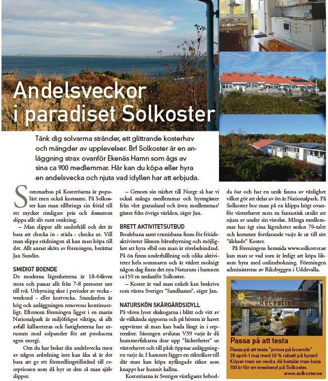 Brf Solkoster – vecka 19 i studiolägenhet om 18,5 kvm på Sydkoster. Vackert belägen på en klippa ovanför Kosterfjorden med altan samt plats för två personer och möjlighet till extrasäng. Enrums studiolägenhet om cirka 18,5 kvm med två enkelsängar samt möjlighet till extrasäng. Lägenheten har matplats med bord, stolar och två extra pallar. Pentry med enkel köksutrustning för fyra personer utrustat med spis med ugn, kylskåp med frys, mikrovågsugn, kaffebryggare, vattenkokare och brödrost. Badrum med dusch och WC. TV finns i lägenheten. Från lägenheten nås en altan med bord och stolar. I anläggningen finns bland annat tennisbana och boulebana samt tvättstuga mot avgift i intilliggande byggnad. I hamnen finns cykeluthyrning och restauranger. Avstånd till Ekenäs hamn och Naturum cirka 150 meter. Närmaste restaurang cirka 50 meter. ICA-butik finns på ön cirka 1,5 km bort. Klippbad cirka 150 meter och badstrand cirka 500 meter. På Sydkoster kan du njuta av Bohusläns vackra natur med klippor, sandstränder och vandringsleder i naturreservatet. Kosteröarna erbjuder ett lugnt och naturnära skärgårdsliv med bad, båtliv och restauranger. Med Kosterfärjan tar du dig enkelt mellan Strömstad och Kosteröarna. Ön är i stort sett bilfri och cykel är ett populärt transportmedel för att ta sig runt på ön.