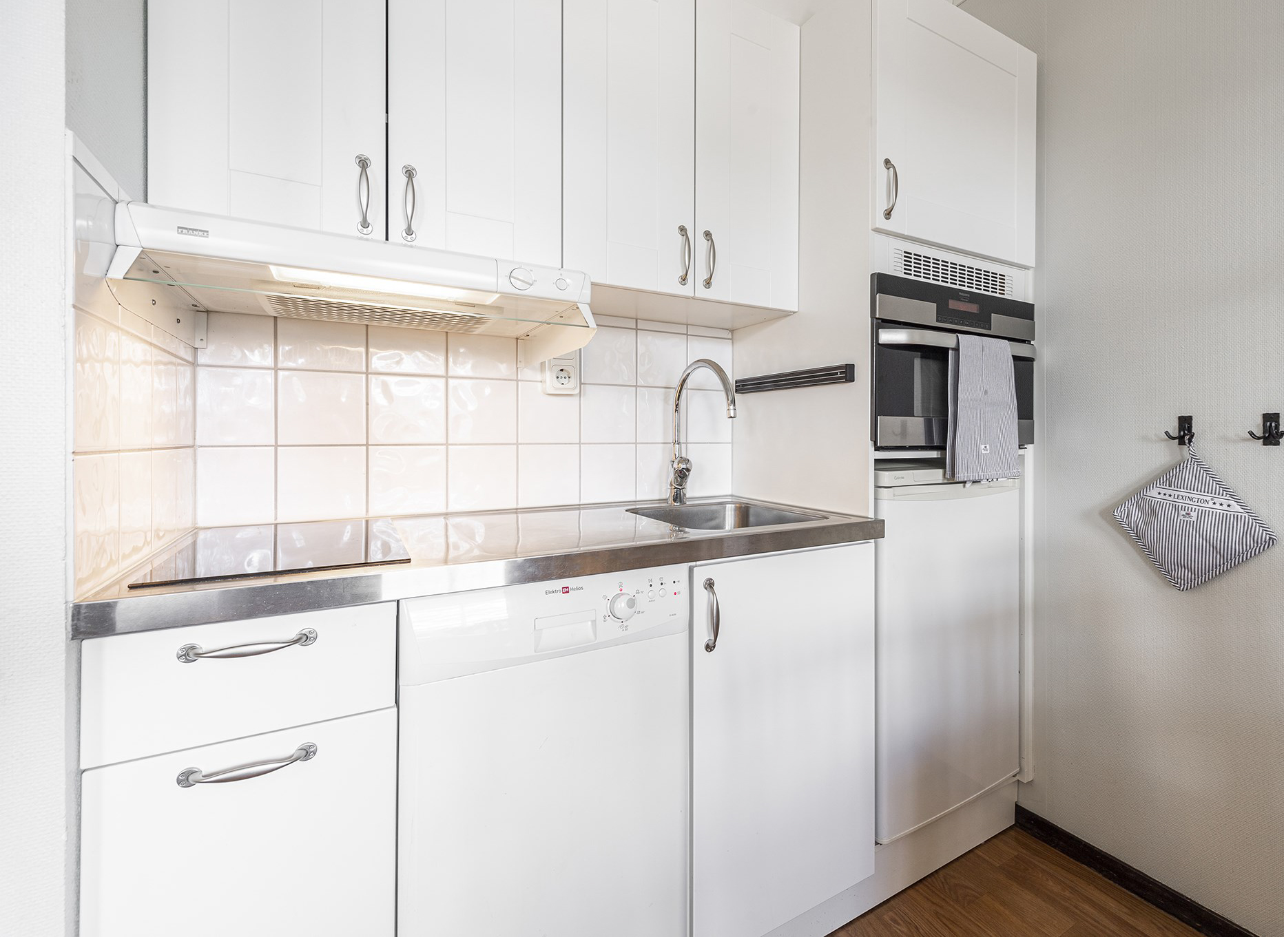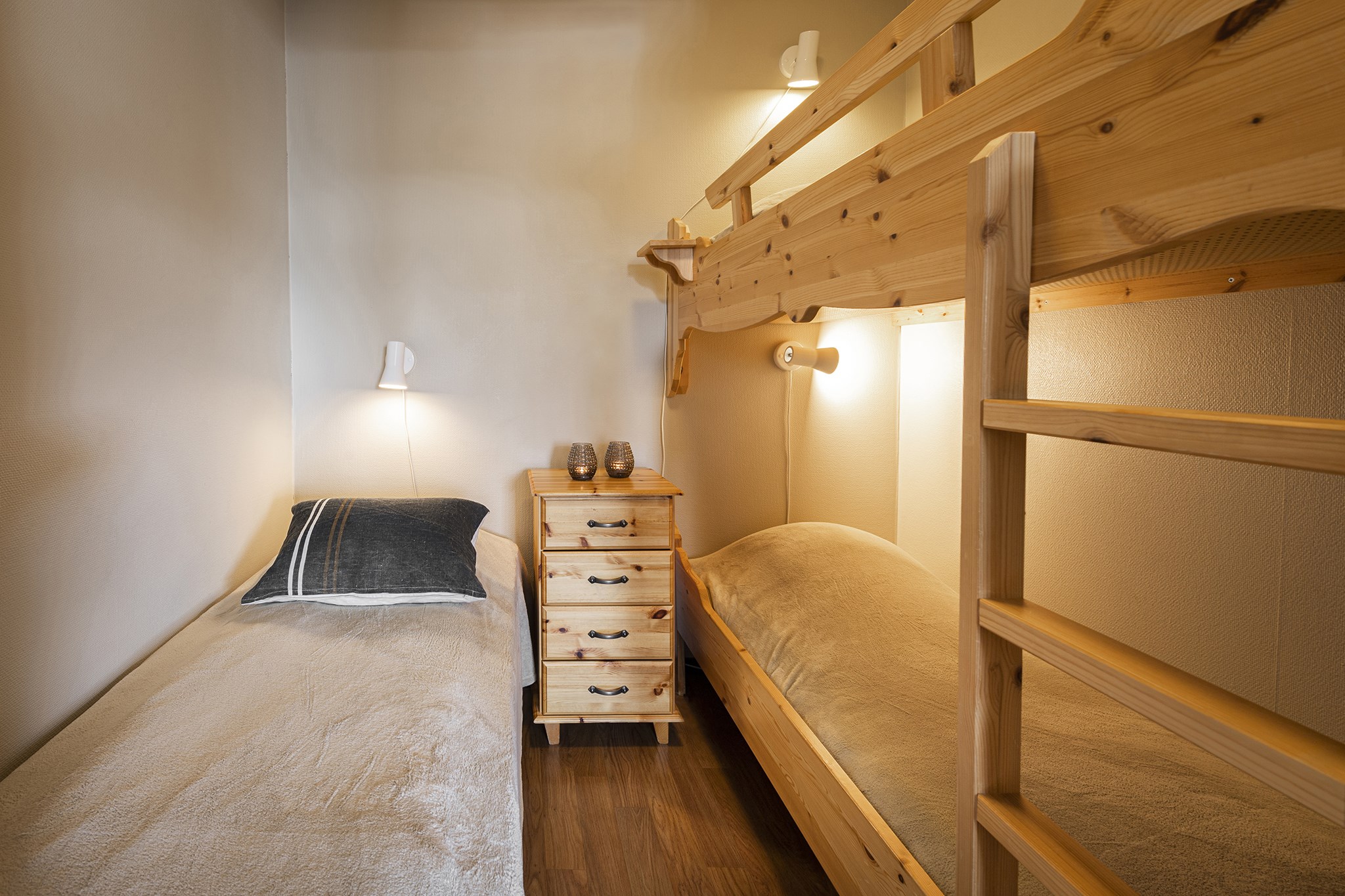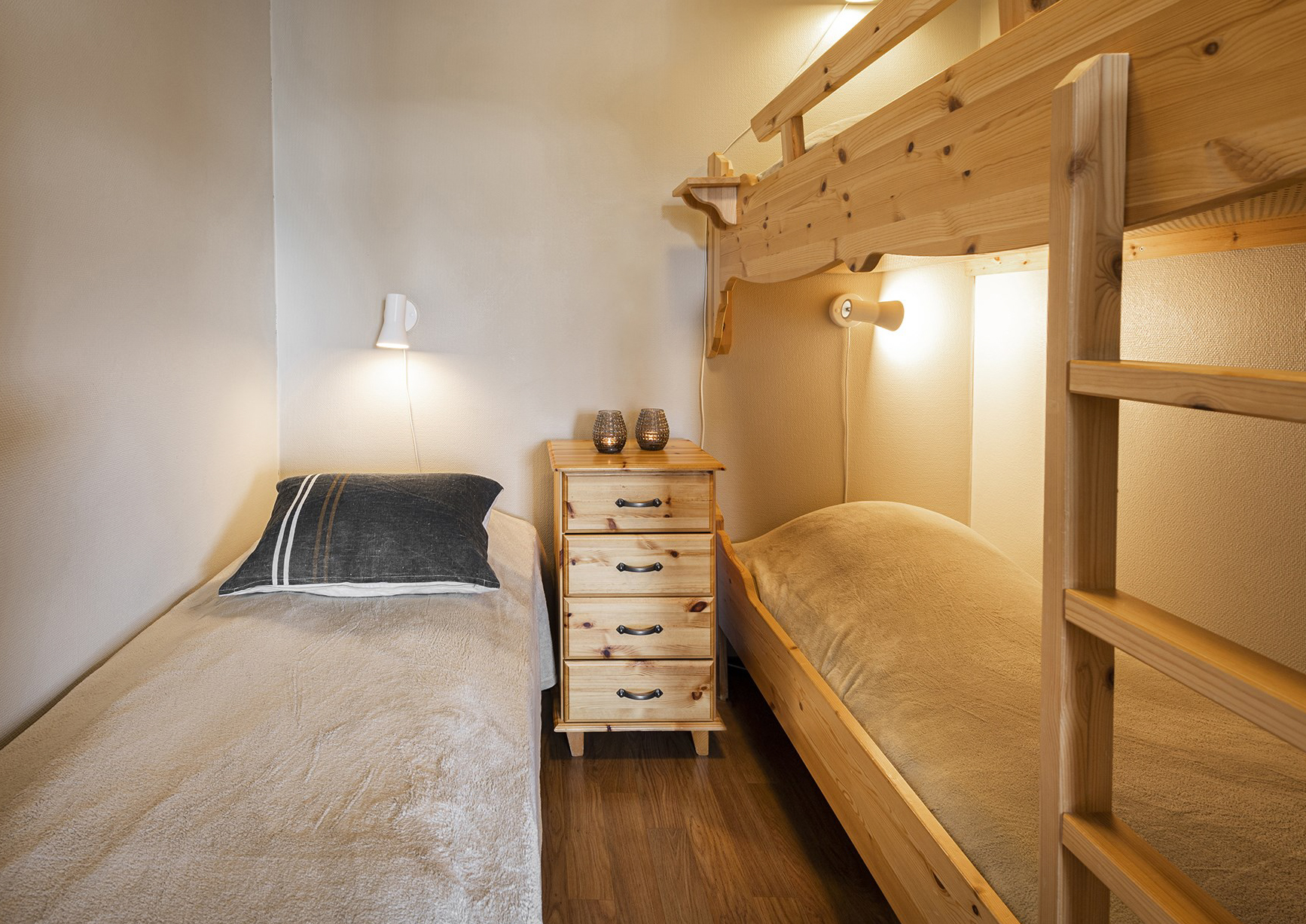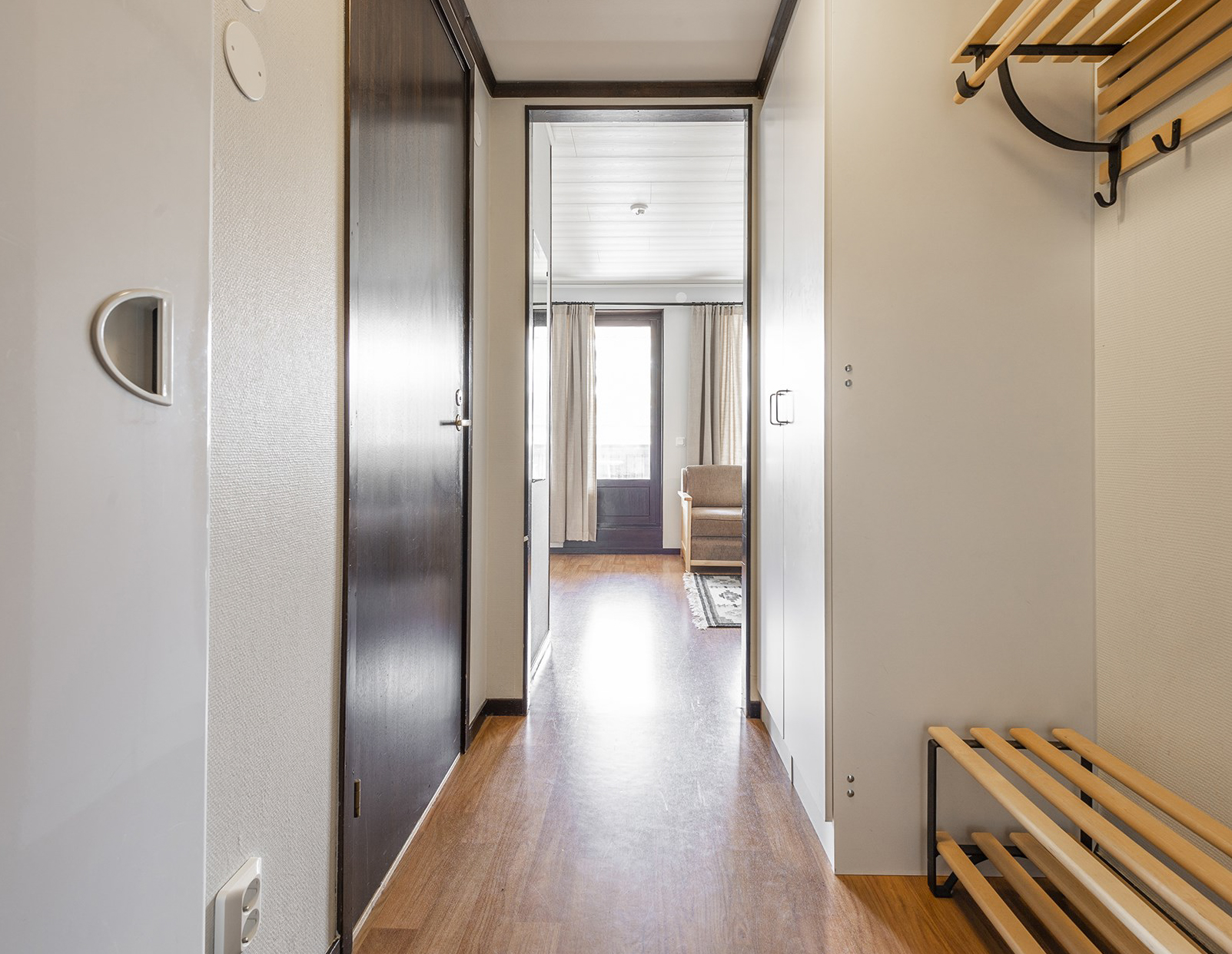 Liten lägenhet på 34 kvm. Kök bänkspis med ugn, kyl, diskmaskin, kaffebryggare. Vardagsrum med matplats, bäddbar soffgrupp en bädd, kabel-tv. Sovalkov med våningssäng om två bäddar samt en enkelsäng. WC, dusch, torkskåp. Skidförråd, tillgång till bastu och pool finns på nedre planet i hotellet.