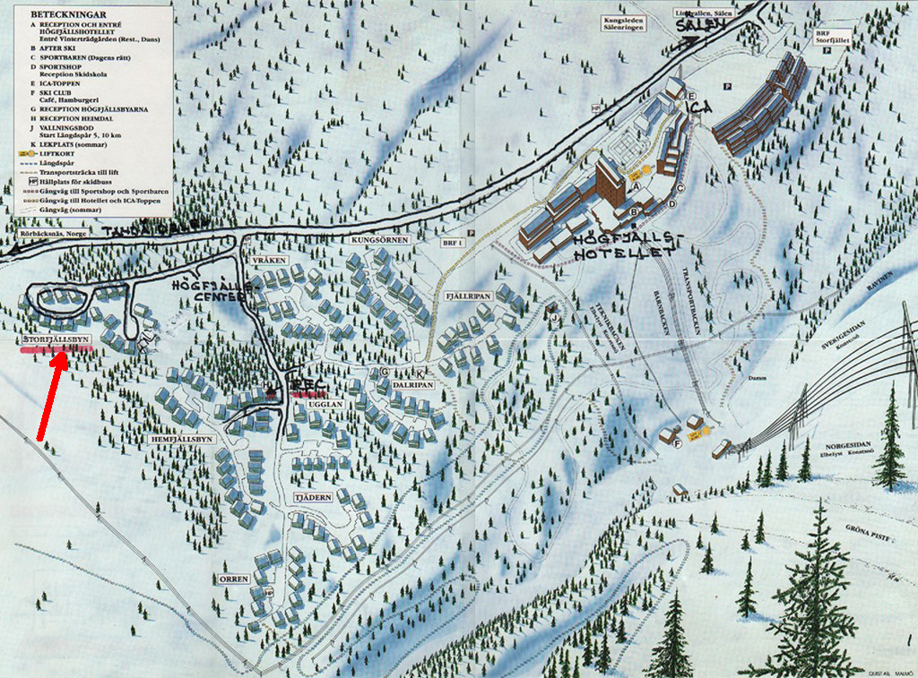 Välkommen till Storfjällsbyn Stugbyn vid Östra Kalvens fot, som kom till 1979, firade 40 år för tre år sedan. Den ligger strax efter du passerat Högfjällshotellet på vänster sida om du kommer från Sälens by. Här finns 21 parhus nära vandringsleder, skidspår, Sälens härliga skidsystem, affärer och nöjen. Vintersäsongen sträcker sig fram till slutet av april och liftarna är igång fram t o m vecka 16. Alldeles innan infarten till Storfjällsbyn ligger HC (Högfjällscenter) med sport shop och skiduthyrning. HC har också en nyöppnad nattklubb XS, bar och pizzeria och på promenadavstånd ligger Högfjällshotellet med restauranger, pub, pianobar, butiker och bio. Inte långt därifrån hittar du Sälens fjällkyrka och hotell Gammelgården och på andra sidan vägen skoteruthyrning och hundspann. Skidbuss går mellan skidanläggningarna under högsäsong. På sommaren finns helt andra aktiviteter såsom mountainbike och där Cykelvasan blivit ett stort evenemang i början av augusti. Storfjällsbyn samverkar med stugbyarna i närheten och bildar tillsammans Högfjällsbyarnas Samfällighetsförening som även inkluderar Hemfjällsbyn och Skogsfåglarna. Stugservice sköts av Byggtjänst i Sälen. De hjälper även till med uthyrningen av din/a andelar mot ersättning om du inte tänker utnyttja själv vid något tillfälle. Nyckelhantering vid uthyrning kommer att ske från nyckelbox vid redskapsboden i Storfjällsbyn. På Storfjällsbyns hemsida (www.storfjallsbyn.se) hittar man det mesta som rör föreningen. På hemsidan hittar du också bra information om vad som finns i stugan och vad du bör ta med dig själv. När det gäller nycklar, ska du få en kolvnyckel av säljaren, med den öppnar du en kolv i förrådsdörren bredvid stugdörren (under ett litet skydd), bakom kolven sitter två nycklar till stugdörren. Dessa två dörrnycklar sätter du tillbaka när du lämnar huset och behåller kolvnyckeln.