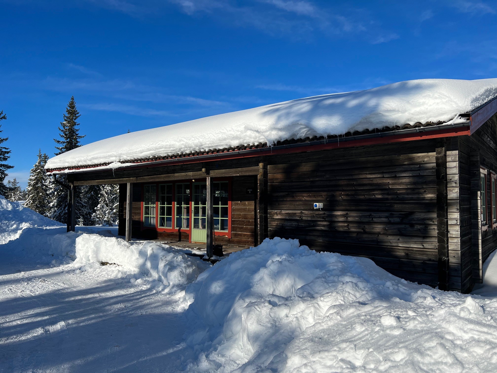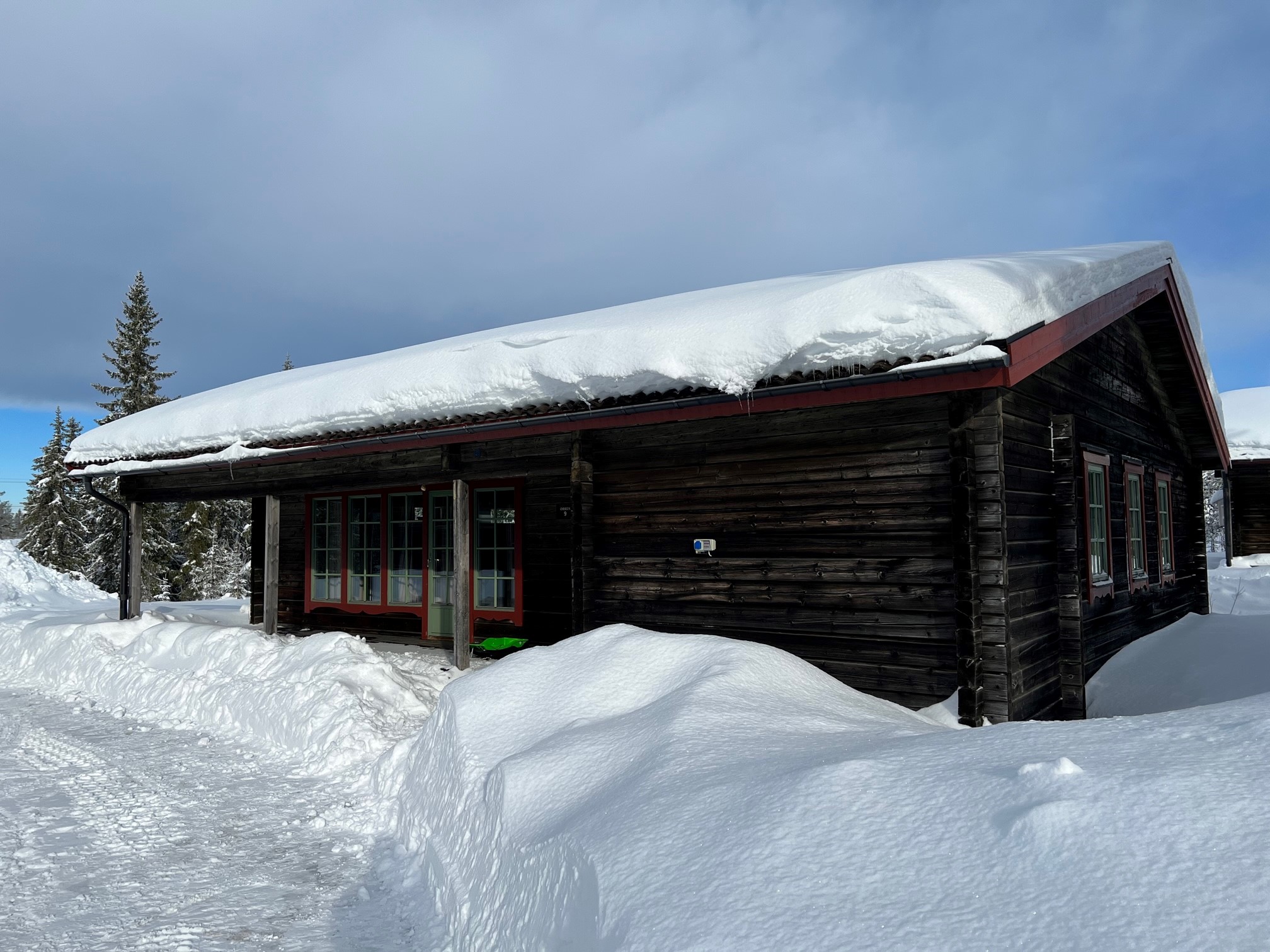 Bilplatser utanför fjällstugan.Bredband