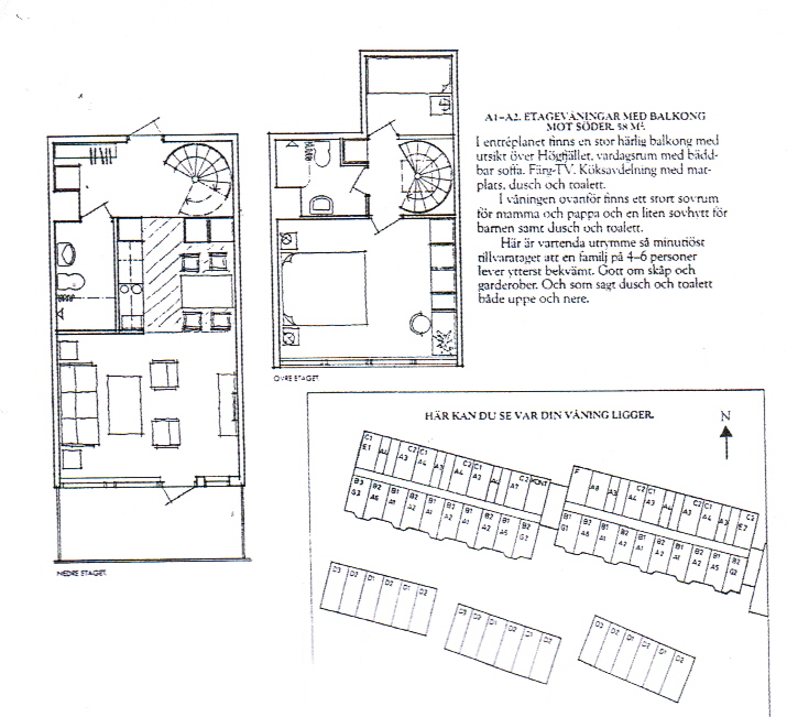 Etagevåning med balkong mot söder 58 kvm. I Entréplanet finns en stor härlig balkong med utsikt över Högfjället, vardagsrum med bädddbar soffa. TV. Köksavdelning med matplats, dusch och toalett. I våningen ovanför finns ett stort sovrum för mamma och pappa och en liten sovhytt för barnen samt dusch och toalett.. Här är varenda utrymme så minitiöst tillvaratagen att en familj på 4-6 personer lever ytterst bekvämt. Gott om skåp och garderober och som sagt dusch och toalett både uppe och nere. Lägenheten är färdigrenoverat mycket gott skick. Alla har nya ytskikt, nya köksluckor och garderobsdörrar, ny arbetsbänk, nytt kakel i kök, ny matta i sovrum, nya fåtöljer och soffa, nytt torkskåp, köksfläkt, nya gardiner mm. En större översyn av gemensamma lokaler och förråd på Brf Högfjället pågår. Detta för att kunna utnyttja lokalerna maximalt, för bättre brandsäkerhet och effektivisera vaktmästarjobbet på bästa sätt. Det har byggts ett antal nya förråd som alla andelsägare har erbjudits att hyra för 500 kr/år. Förrådens mått är H 225 cm, B 90 cm och D 79 cm. Första omgångens förråd är nu uthyrda och ytterligare förråd kommer att färdigställas.