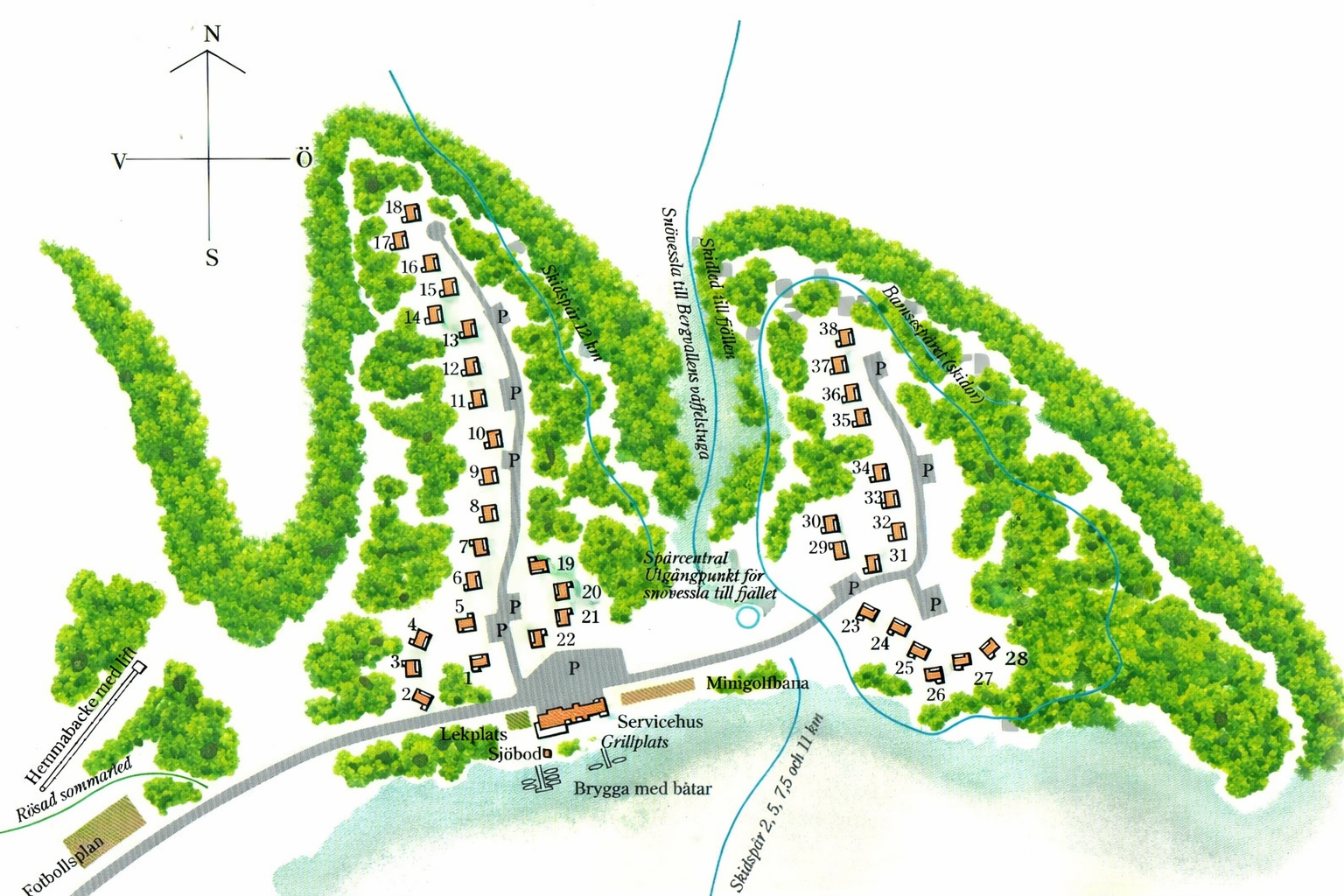 Parkering finns i anslutning till stugorna. Vid servicehuset finns även laddplatser för elbil.Bredband