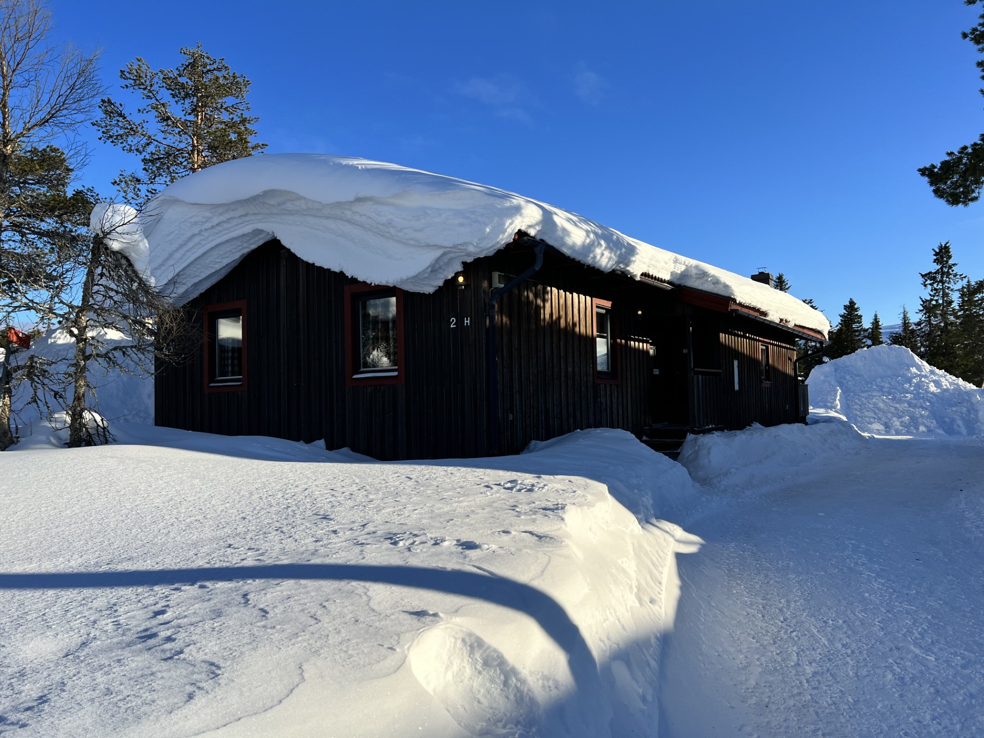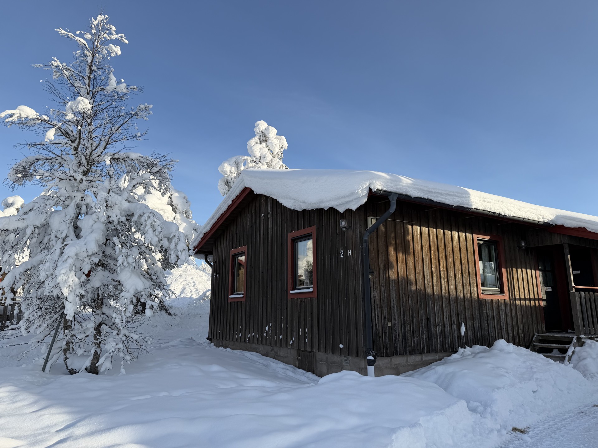 Parkeringsplatser utanför fjällstugan.